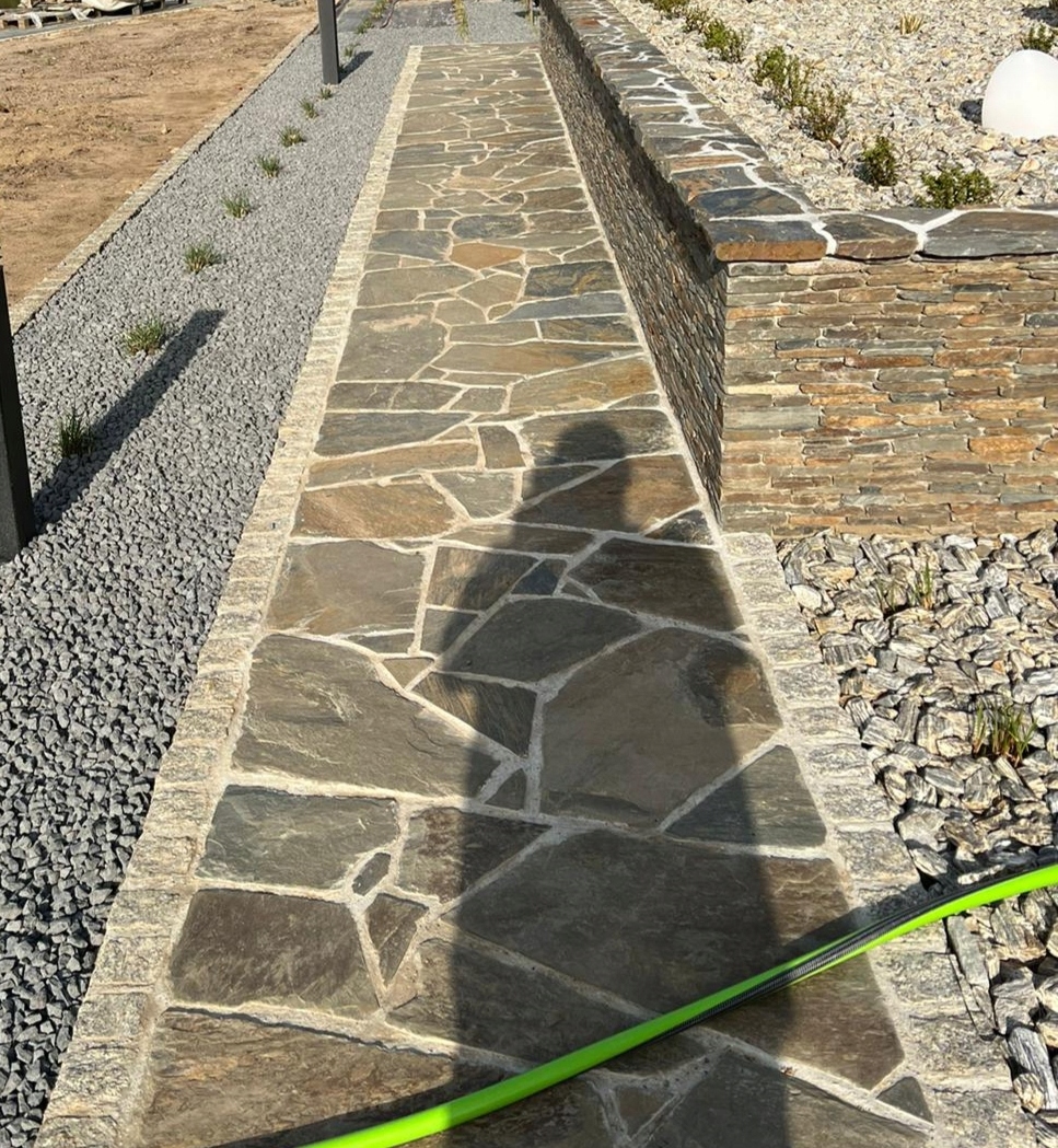 - Плоский и правильный камень, практически такой же, как фасадный камень на 1-2 см толще всего на 2 см, подходит для различных типов полов, подъездных путей, террас и многого другого,