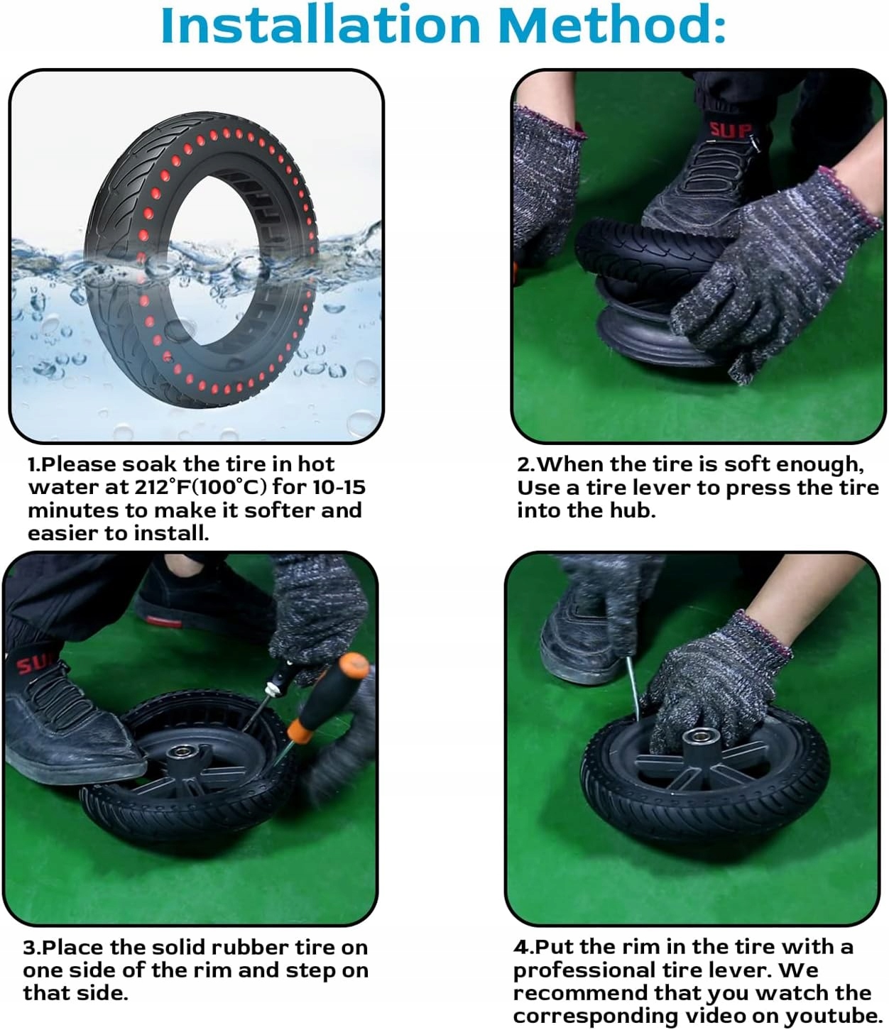 Перед установкой шины поместите ее в кипящую воду на 10 минут, чтобы она стала мягче. Мы рекомендуем сначала посмотреть соответствующие видеоролики по установке на YouTube. Правильная установка может помочь нашим шинам для самокатов работать лучше и обеспечить безопасность во время использования.