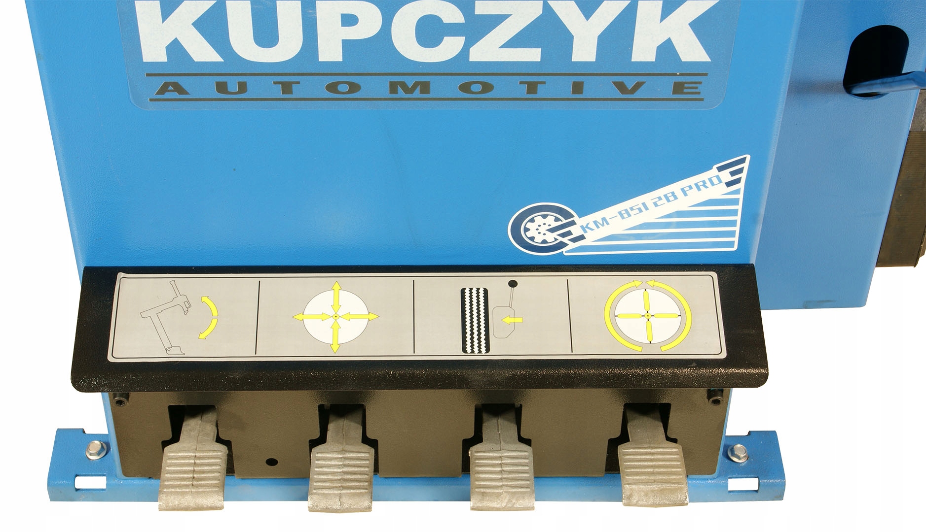 Шиномонтажный станок КМ-851 2Б PRO предназначен для колес диаметром до 26 дюймов (внутреннее крепление обода). Кроме того, данная модель имеет стол с четырьмя челюстями, управляемый прочными и надежными приводами. Машина характеризуется высококачественными механизмами управления как электрической, так и пневматической установками. Примененный в KM-851 2B PRO актуатор бортоотжимателя позволяет получить усилие 2700 кг, а его профилированная форма существенно облегчает снятие шины.