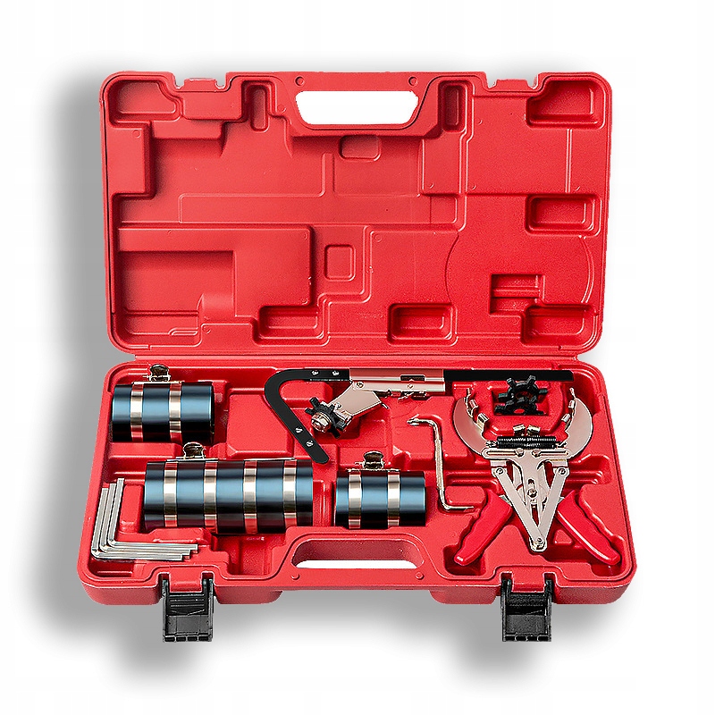 Практический набор инструментов состоит из набора фиксаторов для поршневых колец различного размера, клещей с рабочим диапазоном 50-100 мм и специального приспособления со сменными лезвия для чистки канавок поршня. Модель также поставляется в комплекте с чемоданом для удобной транспортировки.