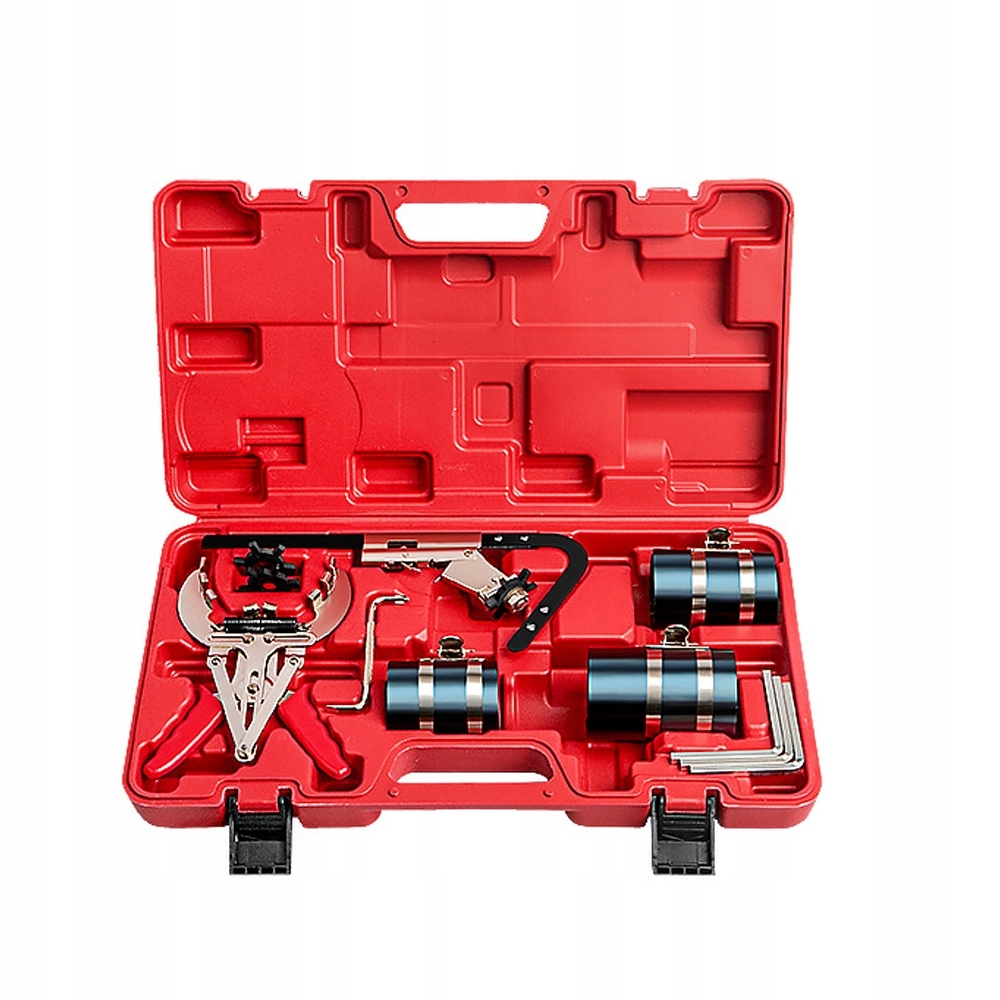 Практический набор инструментов состоит из набора фиксаторов для поршневых колец различного размера, клещей с рабочим диапазоном 50-100 мм и специального приспособления со сменными лезвия для чистки канавок поршня. Модель также поставляется в комплекте с чемоданом для удобной транспортировки.