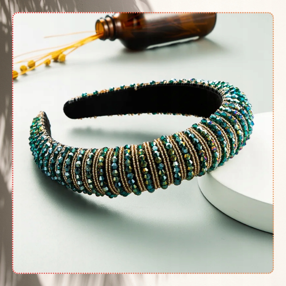 Широка резинка бароко з кристалами, зелена, елегантна, вінтажна