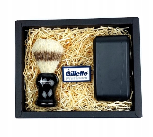 Набор для бритья (помазок + бритва) в подарочной коробке из черного картона.