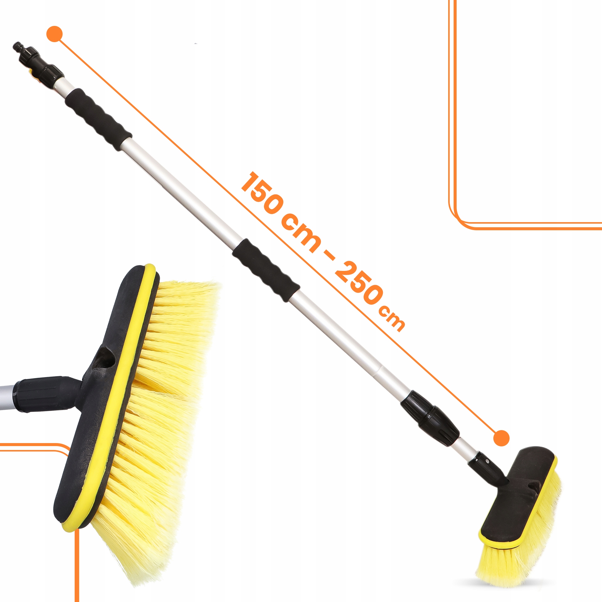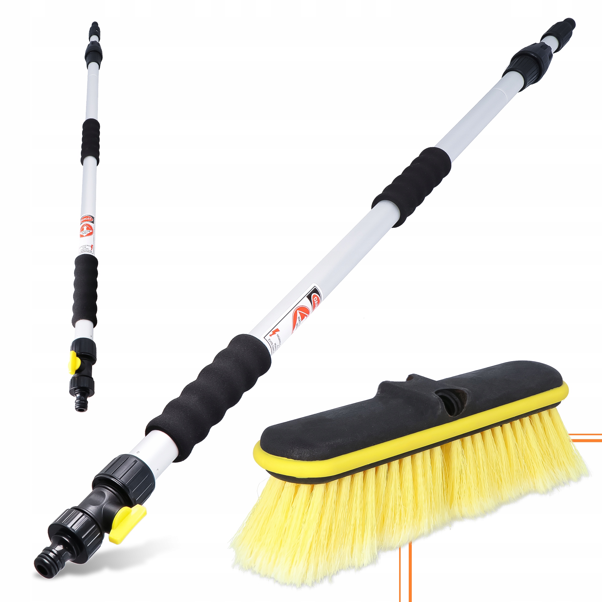 Регулятор расхода воды позволяет точно контролировать поток, а ниппельный конец обеспечивает быстрое подсоединение к шлангу. Щетка идеально подходит для чистки кузовов и стекол грузовых автомобилей, автобусов, лодок и других высоких поверхностей, обеспечивая эффективность и комфорт работы.