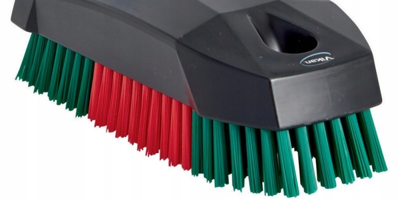 Из полипропилена, армированная сталью, нержавеющая сталь, маленькая твердая щетка с жесткой жесткой щетиной из полиэстера и отверстием, например, для подвешивания. щеточка на настенной направляющей Vikan.