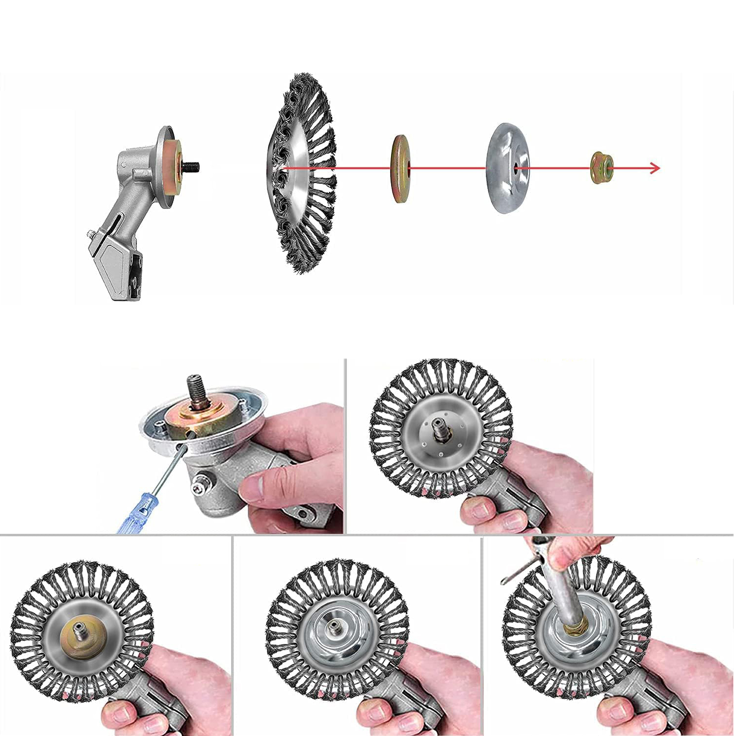Триммер с проволочной щеткой легко устанавливается и снимается.