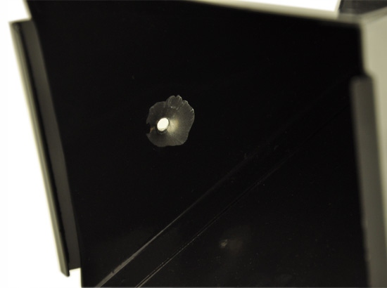 На фото выстрел из карабина мощностью 50 Дж с расстояния 50 см и пулями из тефлоновой стали. После выстрела пулеловушка была слегка помята.