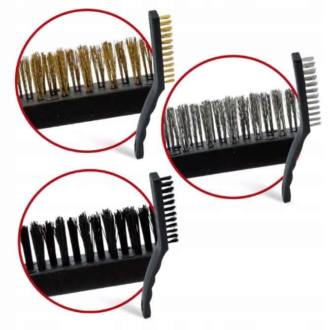 Ручка, идеально подходящая для нашей руки, позволяет быстро и эффективно возвращать очищаемые элементы в исходное состояние. Этот набор кистей предназначен для всех видов чистки и соскабливания. Щетки изготовлены из стали, нейлона и латунной проволоки. Щетки имеют идеальный профиль, что гарантирует высокую эффективность очистки.