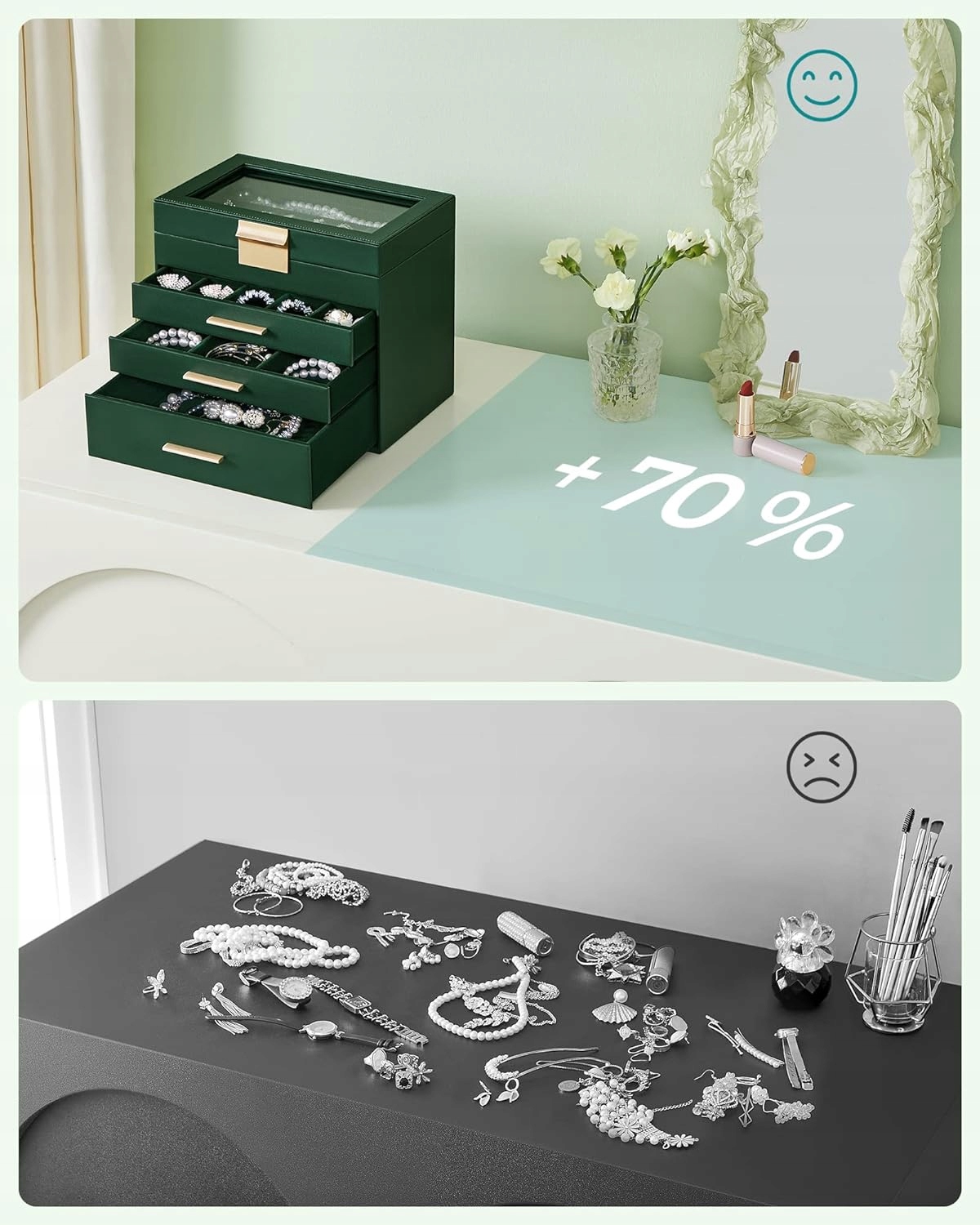 ✔ 4 уровня с многочисленными отделениями для колье, браслетов, колец и сережек.