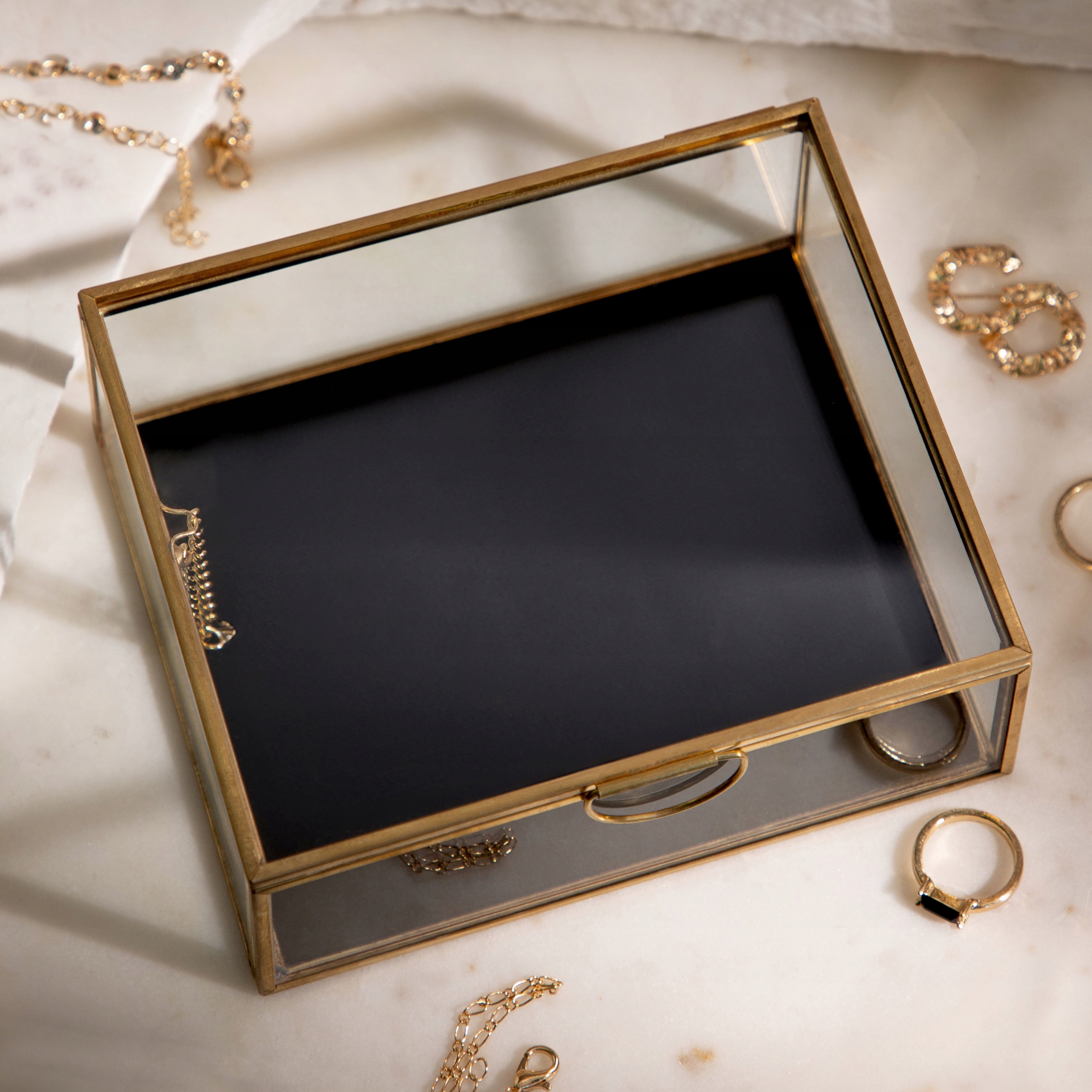 Коробка HOMLA GRAZIAимеет красивый и элегантный вид и минималистичный дизайн. Края коробки выполнены из металла золотистого цвета с блестящей отделкой. Стены выполнены из прозрачного стекла. Дно коробки обтянуто черным бархатом, который красиво подчеркнет очарование хранящихся внутри вещей. Он оснащен изящной полукруглой ручкой и тонкой цепочкой. Разместите его в гостиной, спальне или ванной комнате. Лучше всего он будет смотреться на комоде, полке или туалетном столике. Он идеально подходит для хранения украшений, фотографий, косметики, сувениров и других мелких аксессуаров. Лучше всего он будет смотреться в интерьерах и композициях в стиле современный, минималистский и гламурный.