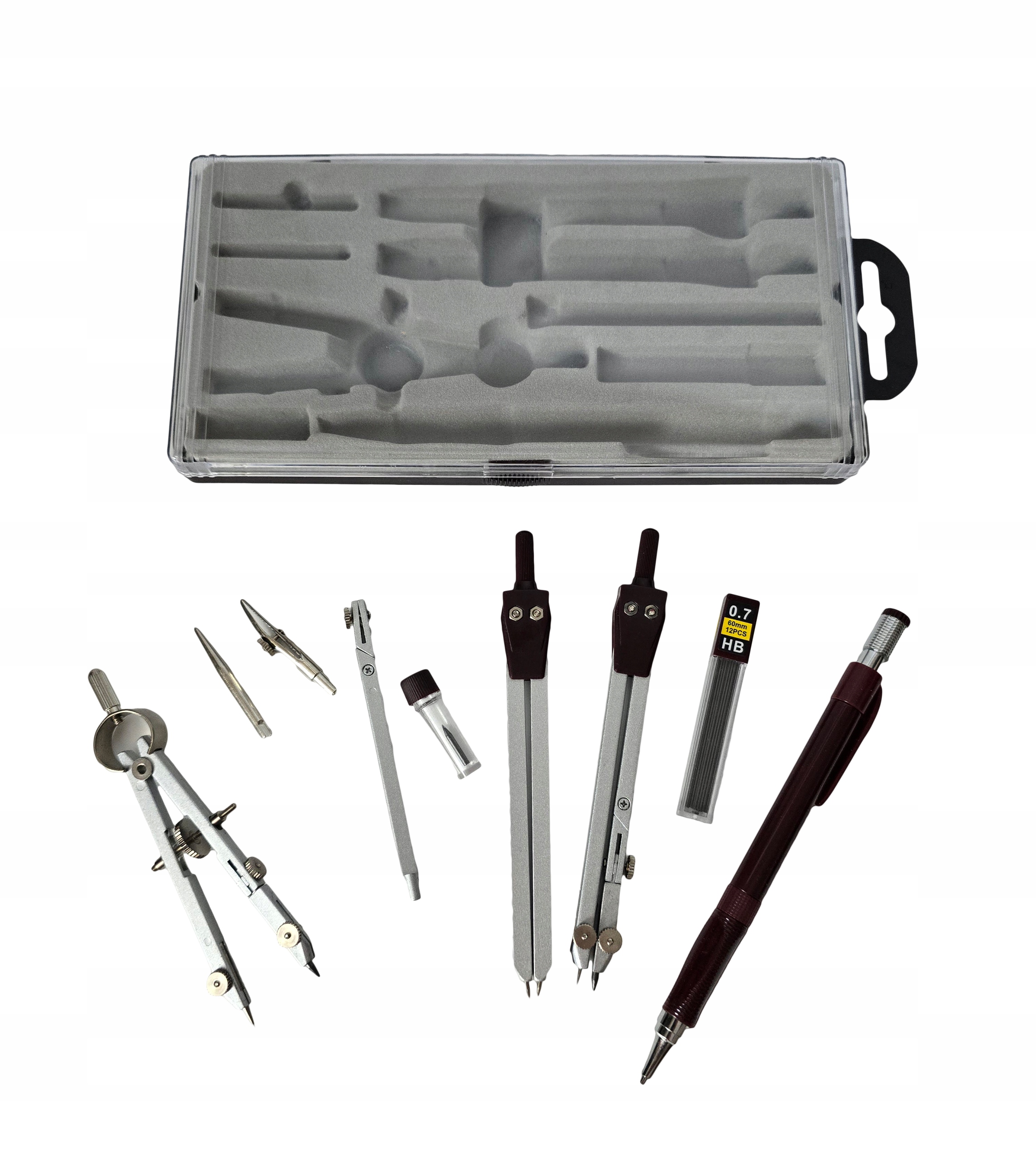 Набор для рисования, состоящий из 10 элементов в практичном футляре, пригодится как в школе, так и на работе, например, в дизайне. Набор циркулей 140 мм, ноль, конвейер, графион, держатель графиона, запасной графион, запасная булавка, удлинитель, запасной графит с держателем, механический карандаш с запасным графитом.