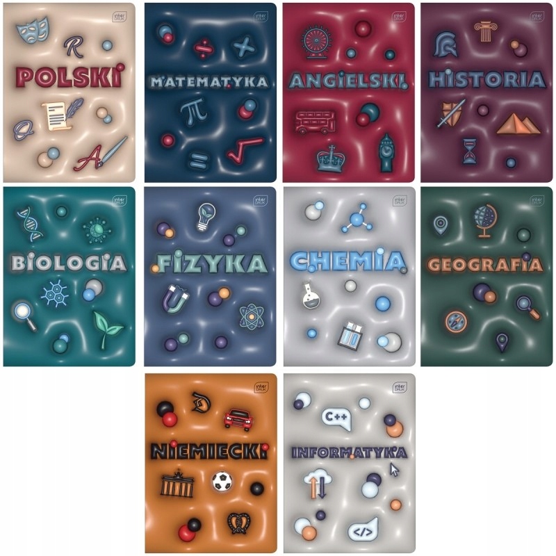 A set of 10 Interdruk subject notebooks with m etaized covers and practical subject tests