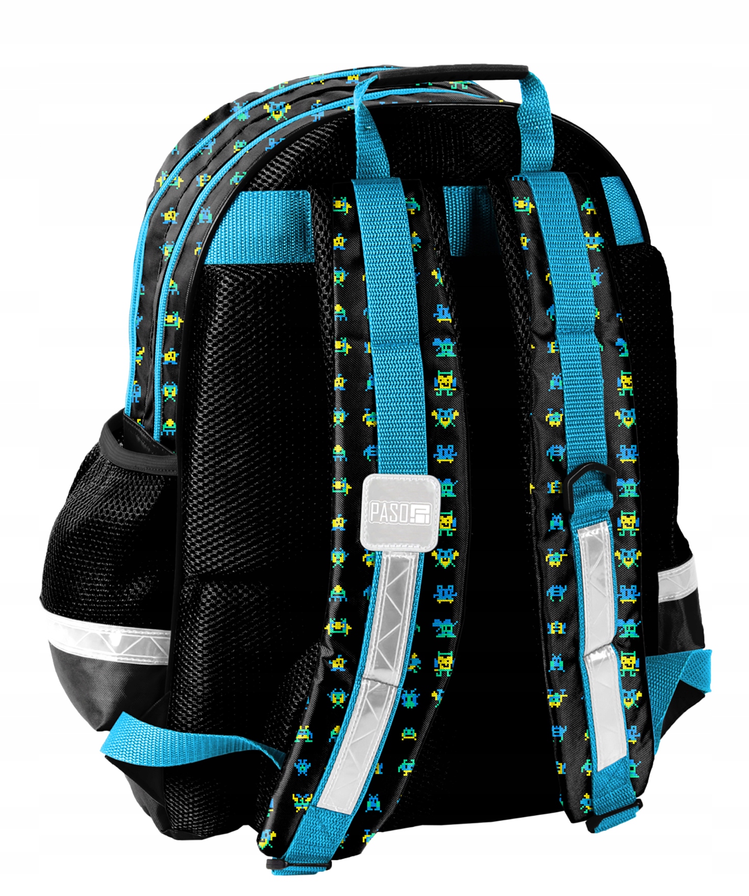 Рюкзак имеет два просторных отделения и два больших передних кармана. Кроме того, он оснащен двумя боковыми сетчатыми карманами, которые идеально подходят для хранение небольших аксессуаров или бутылки с напитком. Жесткая губка, эргономичная форма и регулируемые лямки, покрытые мягким материалом, обеспечивают правильную осанку ребенка и разгружают позвоночник. Рюкзак оснащен жестким дном, усиленным и закрепленным резиновыми ножками. Имеет светоотражающие элементы, повышающие безопасность. Он изготовлен из водонепроницаемого материала. Идеально подходит как для школы, так и для поездок.