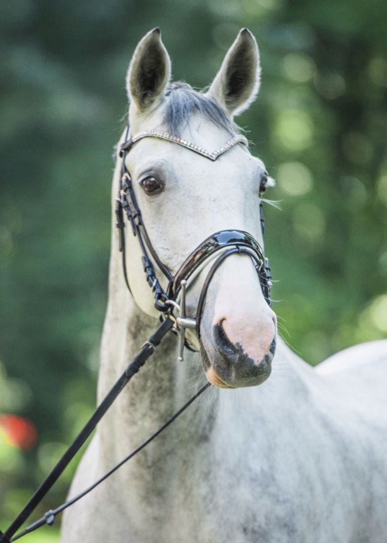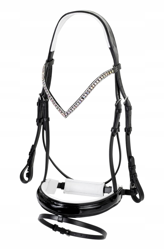Уздечка изготовлена из воловьей кожи. Широкий капсюль соединяется с обеих сторон регулируемыми ремнями. В комплект входят лямки-поводья со стопорами. Капсюль комбинированного типа, регулируемый двойным ремешком. Носовая часть и затылочная часть обшиты мягкой белой кожей. Налобник имеет V-образную форму и украшен бриллиантами.
