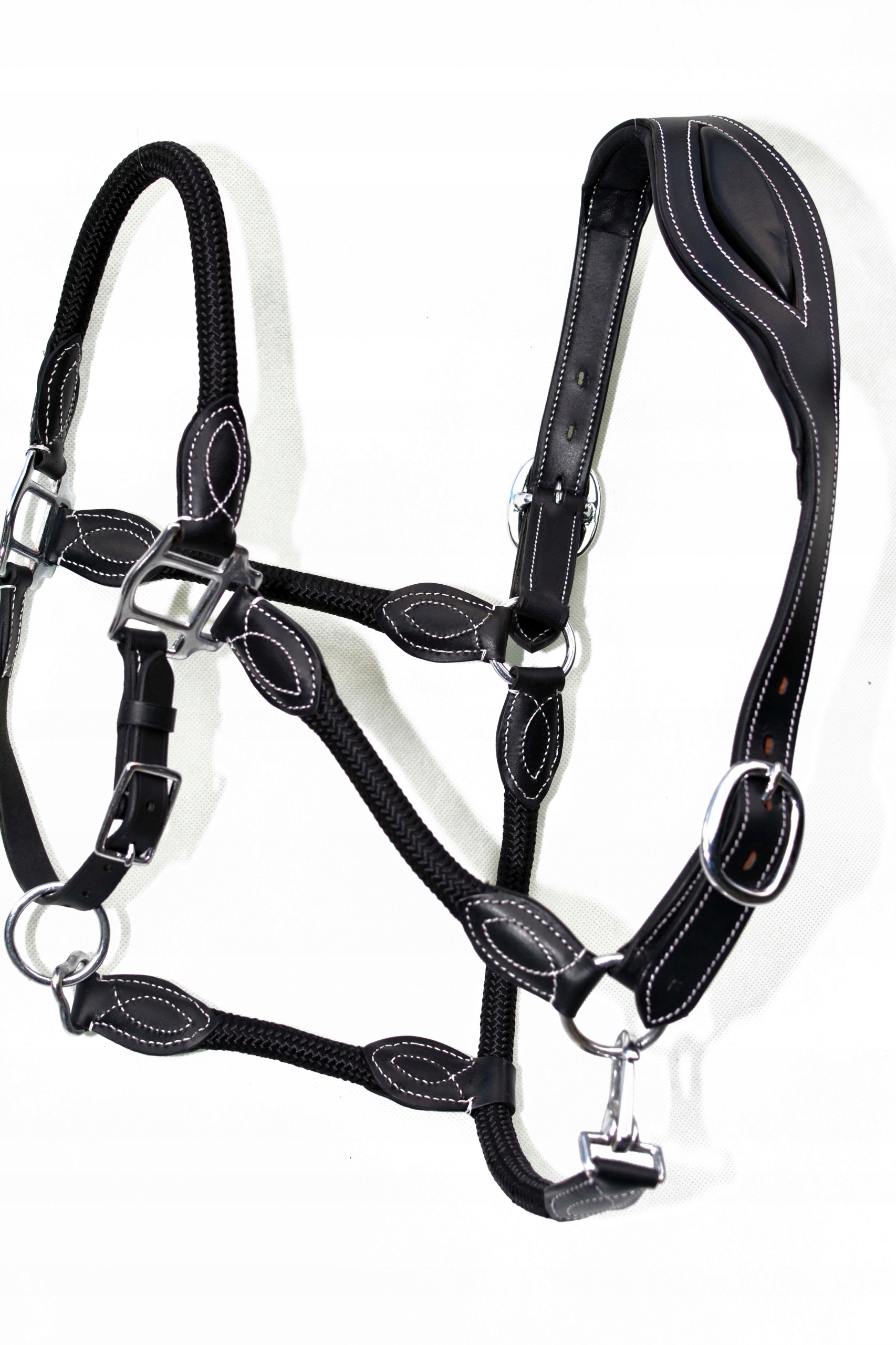 Недоуздок кожаный, анатомический, профилированный, полноразмерный, изготовлен на шорной фабрике в Англии. Изготовлены из высококачественной, очень мягкой натуральной кожи. Анатомический профиль, носовой ремень и затылочный ремешок имеют мягкую подкладку, которая предотвращает любые потертости. Пряжки из очень хорошей нержавеющей стали.