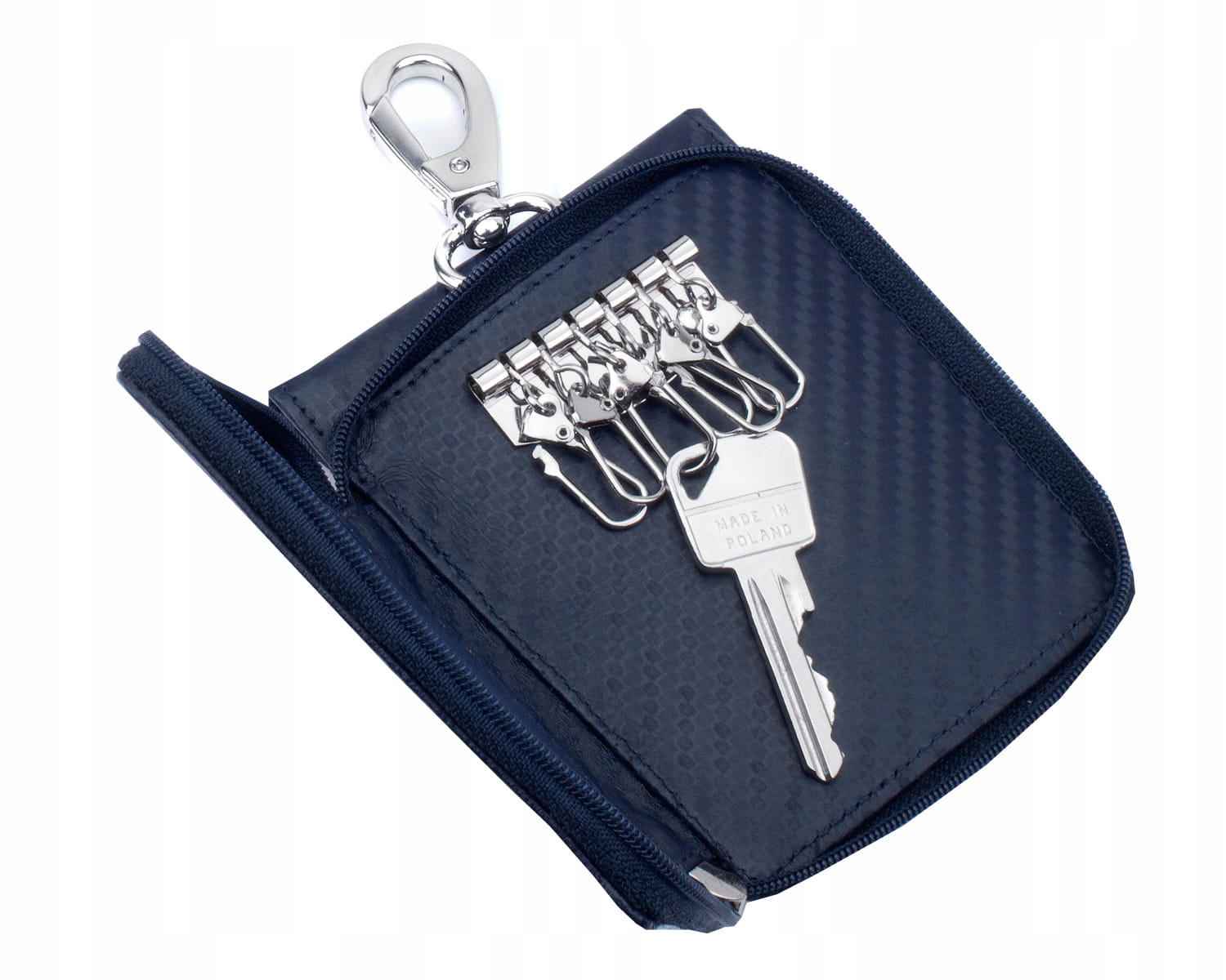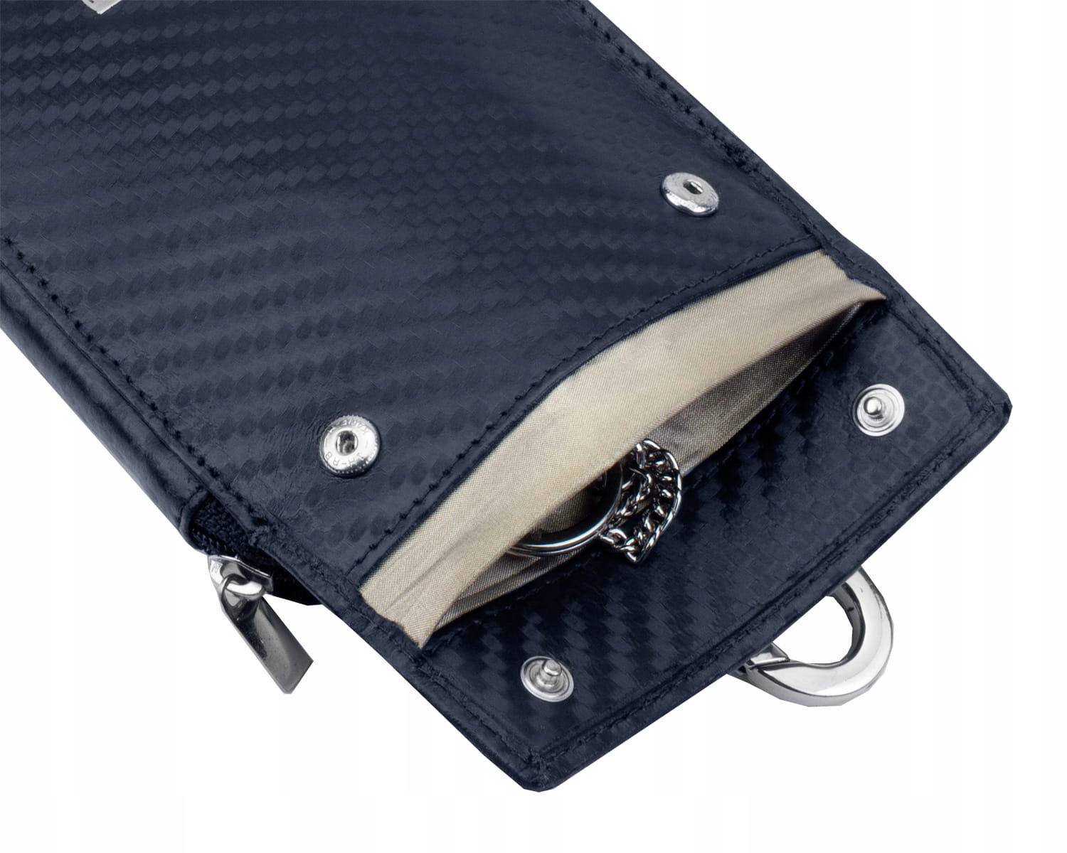 Эта модель, помимо кармана с БЕЗКЛЮЧЕВОЙ защитой, имеет еще внешний карман на молнии. Внутри кармана 6 карабинов для классических плоских ключей.