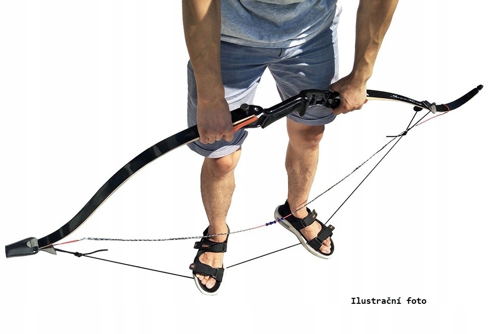 Сначала один конец тетивы свободно надевается на кончик одного плеча лука, а затем помещается карман для стрингера. Другой конец/проушина натяжителя находится на другом рычаге. Центр бантика держат одной рукой, на центр лески наступают и натягивают так, чтобы бантик сгибался так же, как при его рисовании. Это укорачивает лук ниже его обычной длины, и теперь тетиву можно легко надеть на другую руку. При использовании натяжителя нам нужно прилагать гораздо меньше усилий, чем при натяжении тетивы вручную, когда лук скручивается и натягивается без необходимости.