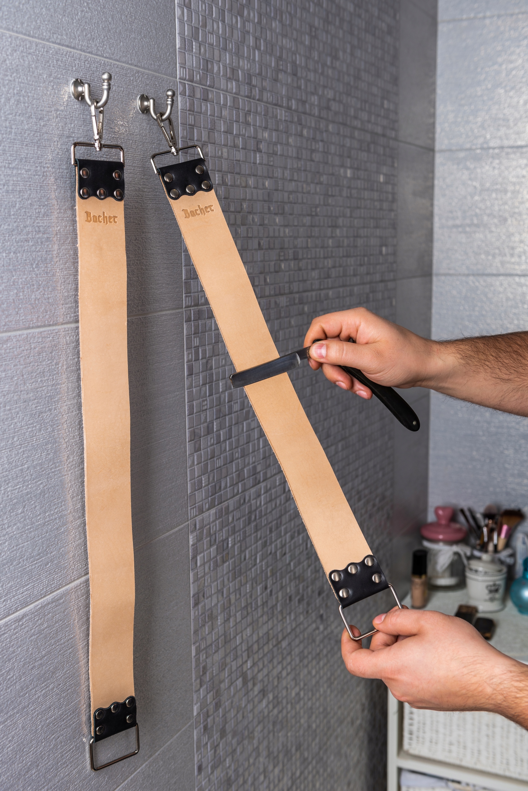 Ремень оснащен с одной стороны удобной ручкой, а с другой стороны карабином для подвешивания на крючок. Карабин также позволяет прикрепить ремень куда угодно, в том числе к брючному ремню. В комплект входит крючок для крепления на стену. Длина и ширина ремня обеспечивают комфортную заточку бритвы, а никелированный карабин и ручка позволяют удобно закрепить ремень и правильное напряжение. Все упаковано в оригинальный прочный чехол с логотипом Bacher, обеспечивающий безопасное хранение и транспортировку.