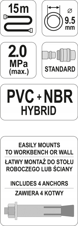 ГИБРИДНЫЙ ПНЕВМАТИЧЕСКИЙ ШЛАНГ НА КАТУШКЕ 9,5 ММ x 15 М С БЫСТРОРАЗЪЕМНЫМИ СОЕДИНЕНИЯМИ