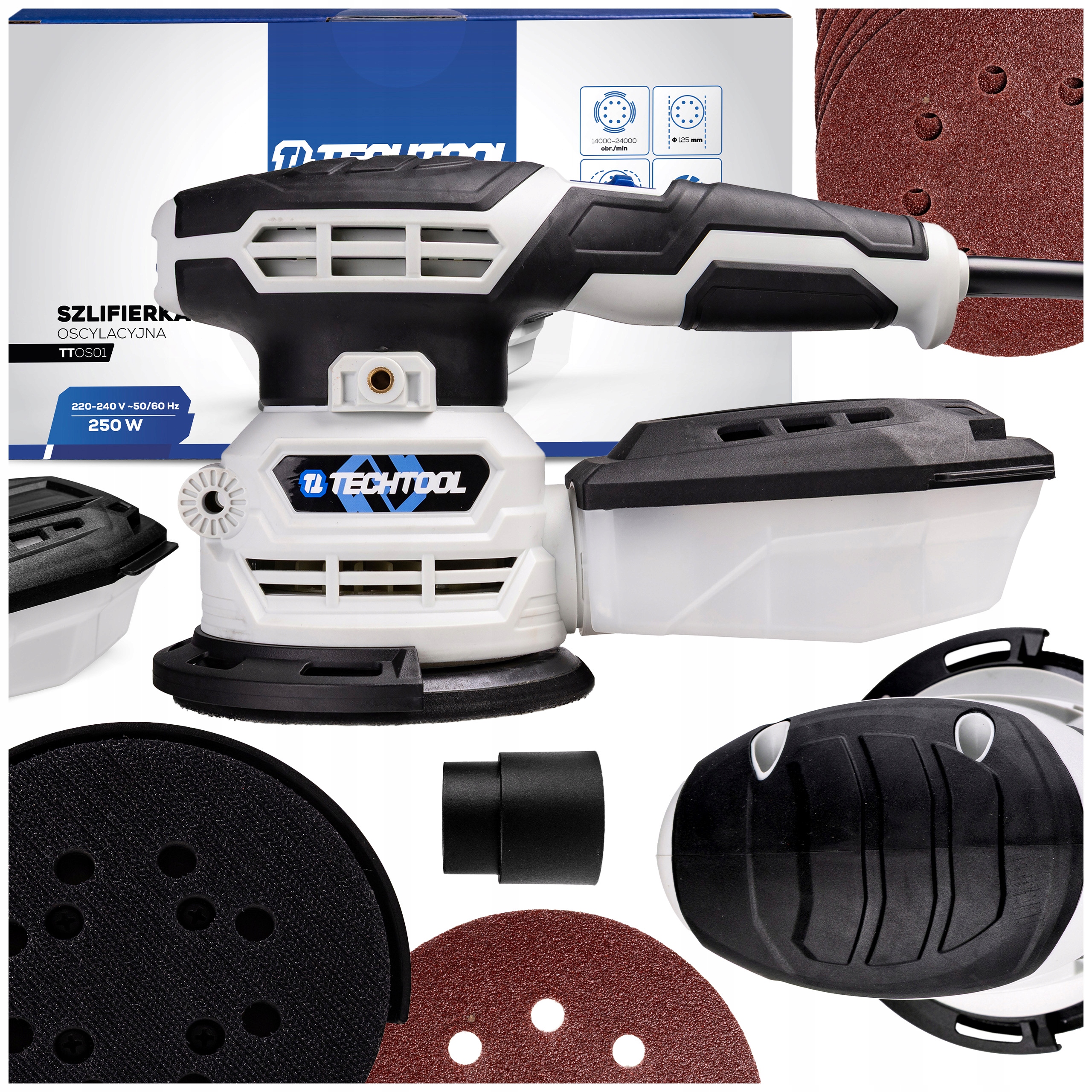 - Аксессуары: 10 наждачных бумаг P80, контейнер для сбора пыли, переходник для пылесоса, оригинальная упаковка производителя, руководство пользователя на польском языке.