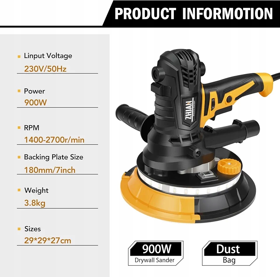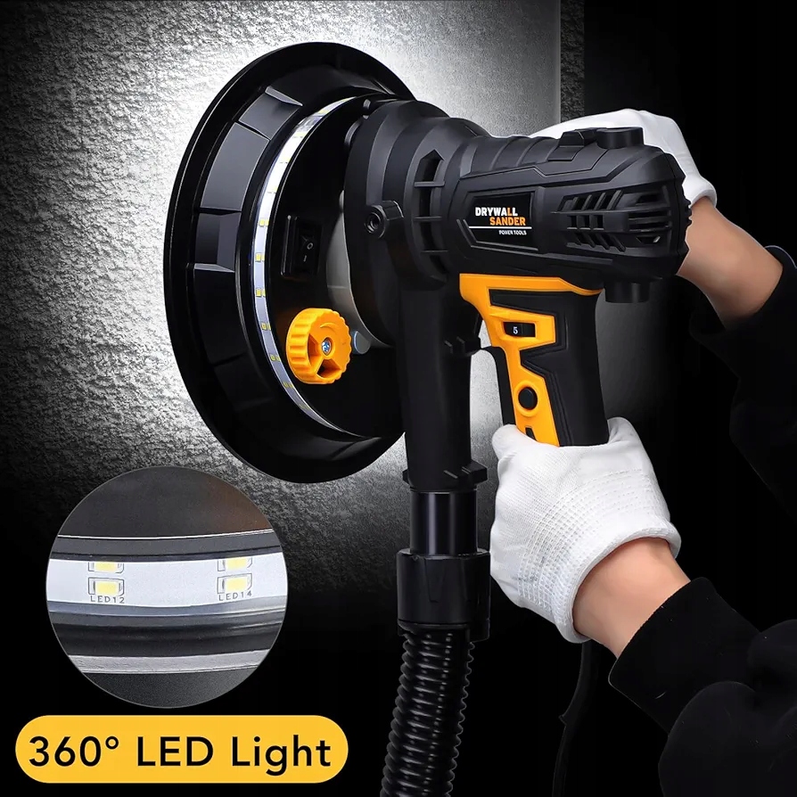 ZHJAN 900 Вт шлифовальная машина для гипсокартона, 1400–2700 об/мин, электрическая шлифовальная машина для стен, светодиодная подсветка, мешок для пыли, шланг, 5-скоростная дисковая шлифовальная машина, шлифовка