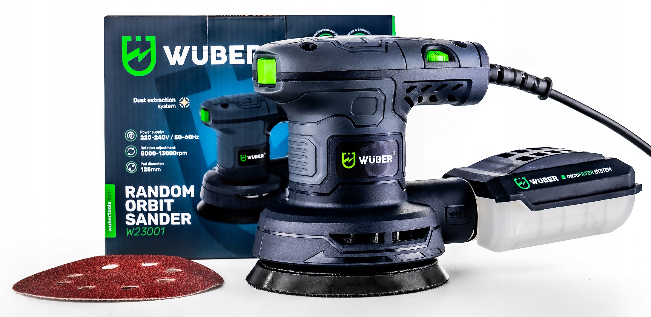 Качественная эксцентриковая шлифовальная машинка WUBER► Система пылеудаления ► Высокая мощность 1100 Вт ► Эргономичная форма ► Компактный размер ► Регулировка скорости ► Застежка-липучка