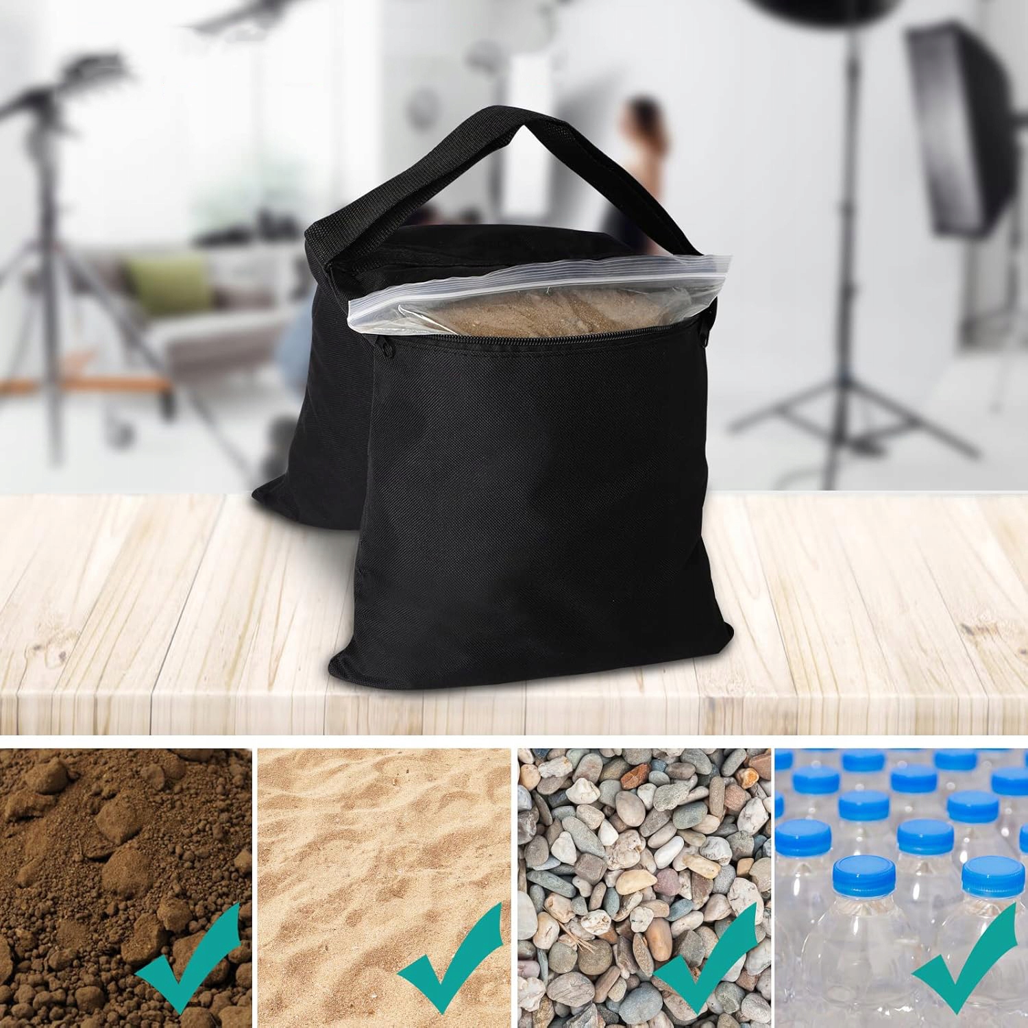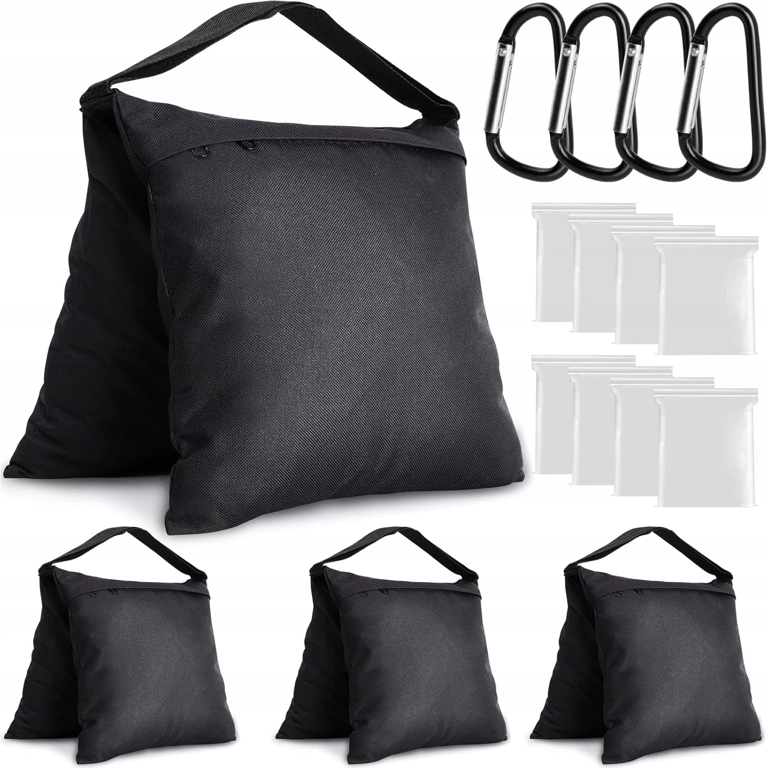 - Легко в использовании, сначала вылейте песок или гравий в узкий пластиковый пакет, затем положите пластиковый пакет в песочный пакет и, наконец, повесите его в то место, где он необходим. Фольга предотвратит падение мешка Оксфорда, алюминиевые зажимы помогут прикрепить сумку с песком.