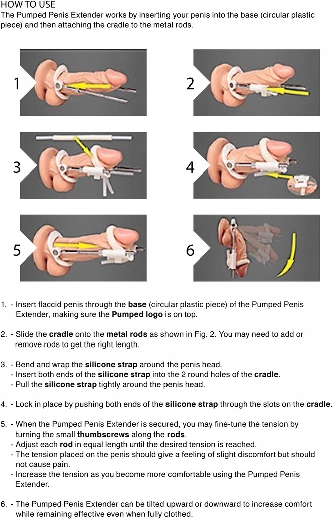Это расширение полового члена увеличивает как длину, так и окружность полового члена, используя адгезию из пружинных стальных стержней, чтобы помочь естественной способности организма меняться и развиваться под физическим влиянием. Если вы прикрепите половой член к непрерывному растяжению, клетки начнут делиться и умножить, тем самым увеличивая вес ткани.