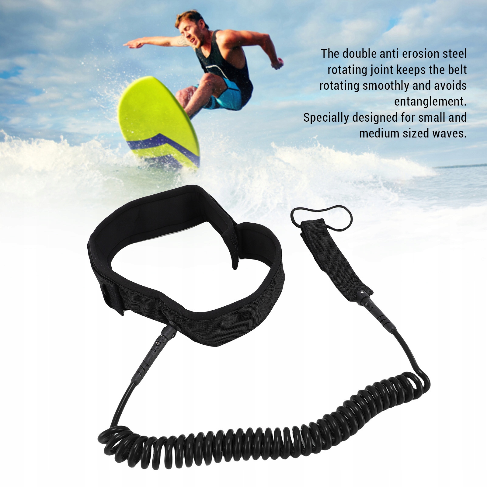 1. Прочный и не спутывается: наш поводок для серфинга, изготовленный из 7-миллиметровой веревки из ТПУ, обеспечивает высокую прочность и долговечность. Поводок из двойной антиэрозионной стали обеспечивает плавное вращение и предотвращает запутывание, что делает его пригодным для средних и небольших волн.