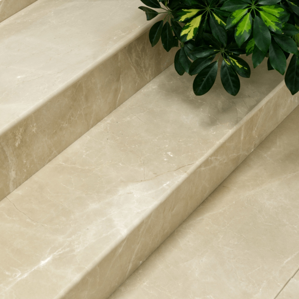 Ступенька из полированного мрамора Crema Marfil New с закругленным краем 135×33×2 см – элегантный отделочный элемент, предназначенный для роскошных интерьеров. Теплый бежевый оттенок с нежной естественной прожилкой придает помещению легкость и престиж. Полированная поверхность прекрасно отражает свет, визуально увеличивая пространство. Этот мрамор идеально сочетается с классическими, яркими композициями - идеально подходит для гостиных, лестниц и офисов.