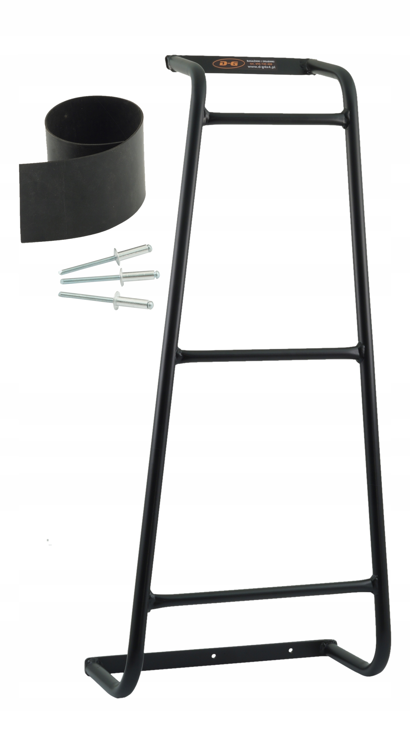 Лестница не повредит кузов вашего автомобиля. Просто установите верхнюю часть на кромку двери, а нижнюю закрепите заклепками в незаметном месте под номерным знаком. Ручки покрыты противоскользящей резиной, защищающей от повреждения лакокрасочного покрытия.