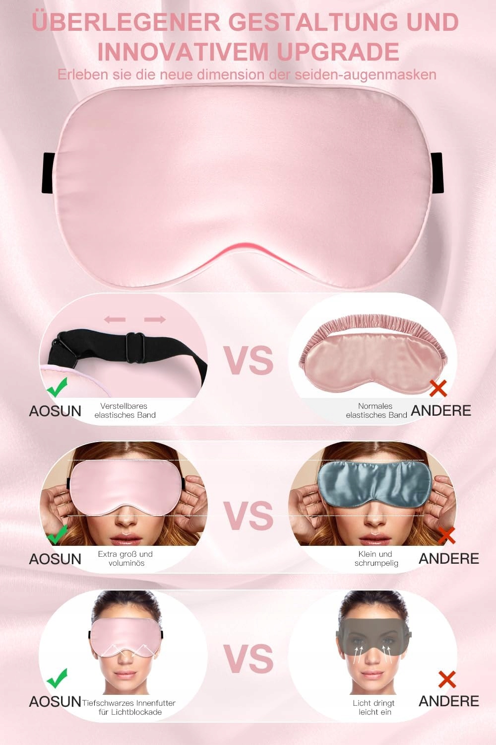 Защита от влаги - шелковая маска Aosun очень хорошо поглощает влагу. Он поглощает избыточную влагу из окружающей среды и медленно отдает его коже. Это помогает поддерживать влагу вокруг глаз и предотвращает прыщи. После пробуждения глаза очень свежие и приятные на ощупь, они больше не сухие и напряженные, как раньше.