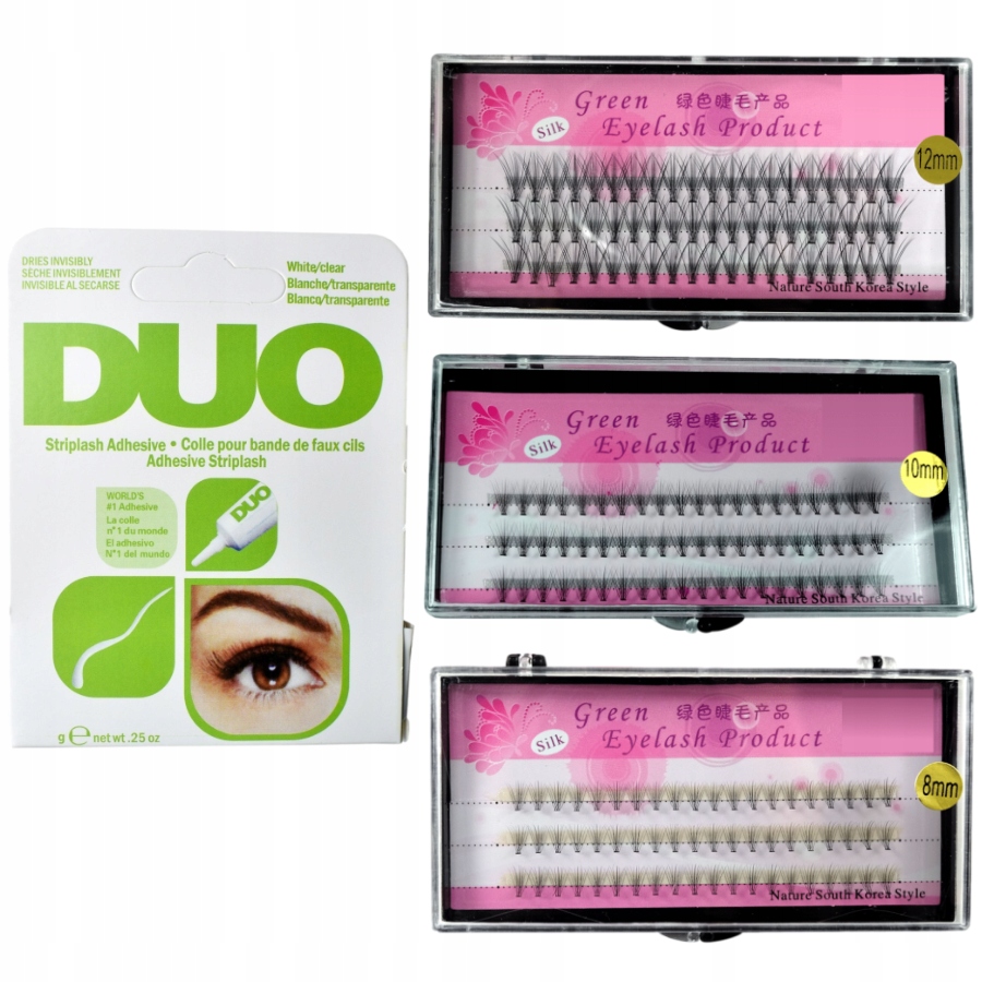 b>: 1 упаковка (60 шт.) шелковых ресниц пучками 8 мм, 1 (60 шт.) упаковка шелковых ресниц пучками 10 мм, 1 (60 шт.) упаковка шелковых ресниц 12 мм пучки и прозрачный клей для ресниц 7 гр.Профессиональный клей с аппликатором идеально подходит для накладных ресниц. Подходит также для приклеивания ресниц пучками.