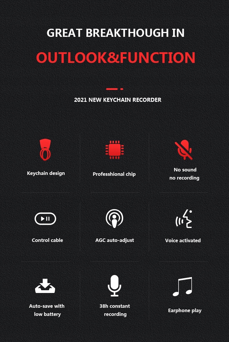 Микрофон достаточно чувствителен, чтобы регистрировать звук даже на расстоянии 12 метров! Незаметная работа означает, что он не вызывает никаких подозрений, поскольку не вибрирует во время записи, не загораются никакие диоды и никаких звуков. Визуально он функционирует как стандартный брелок для ключей.
