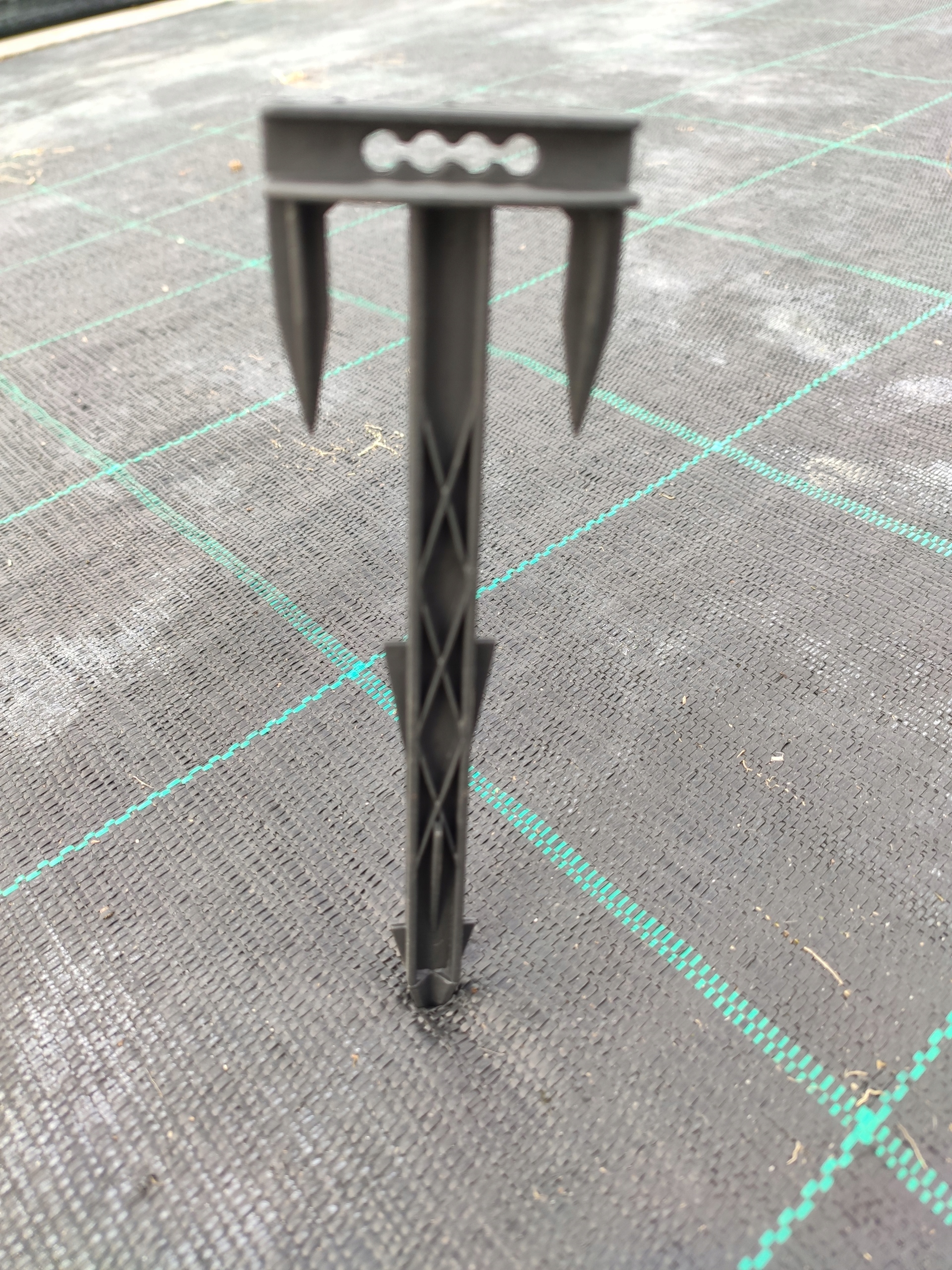Большой диаметр головки прижимает прикрепленное изделие к земле, предотвращая его подъем и смещение. Острый конец булавки позволяет легко проколоть толстый агротекстиль или детский коврик без использования ножа. Форма гарпуна обеспечивает прочный якорь в земле и затрудняет выдергивание штыря из земли.