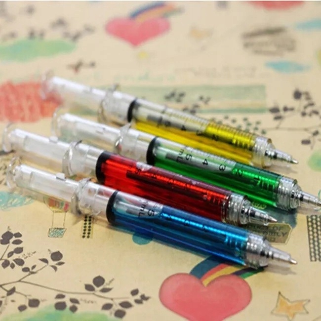 Дополнительный эффект красочного вещества внутри делает ручку похожей на настоящий шприц. Но не волнуйтесь, это всего лишь визуальная шутка.