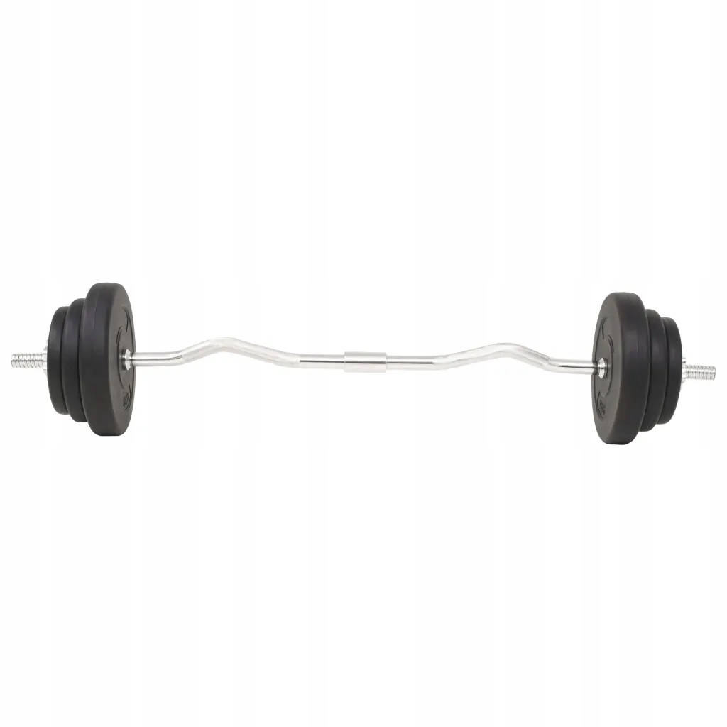Универсальный набор со штангой и гантелями идеально подходит для тренировки груди, бицепсов, плеч, трицепсов и мышц спины. Включает две гири по 5 кг, четыре гири по 2 кг, четыре гири по 1,25 кг, одну штангу и две гантели общим весом около 30 кг.