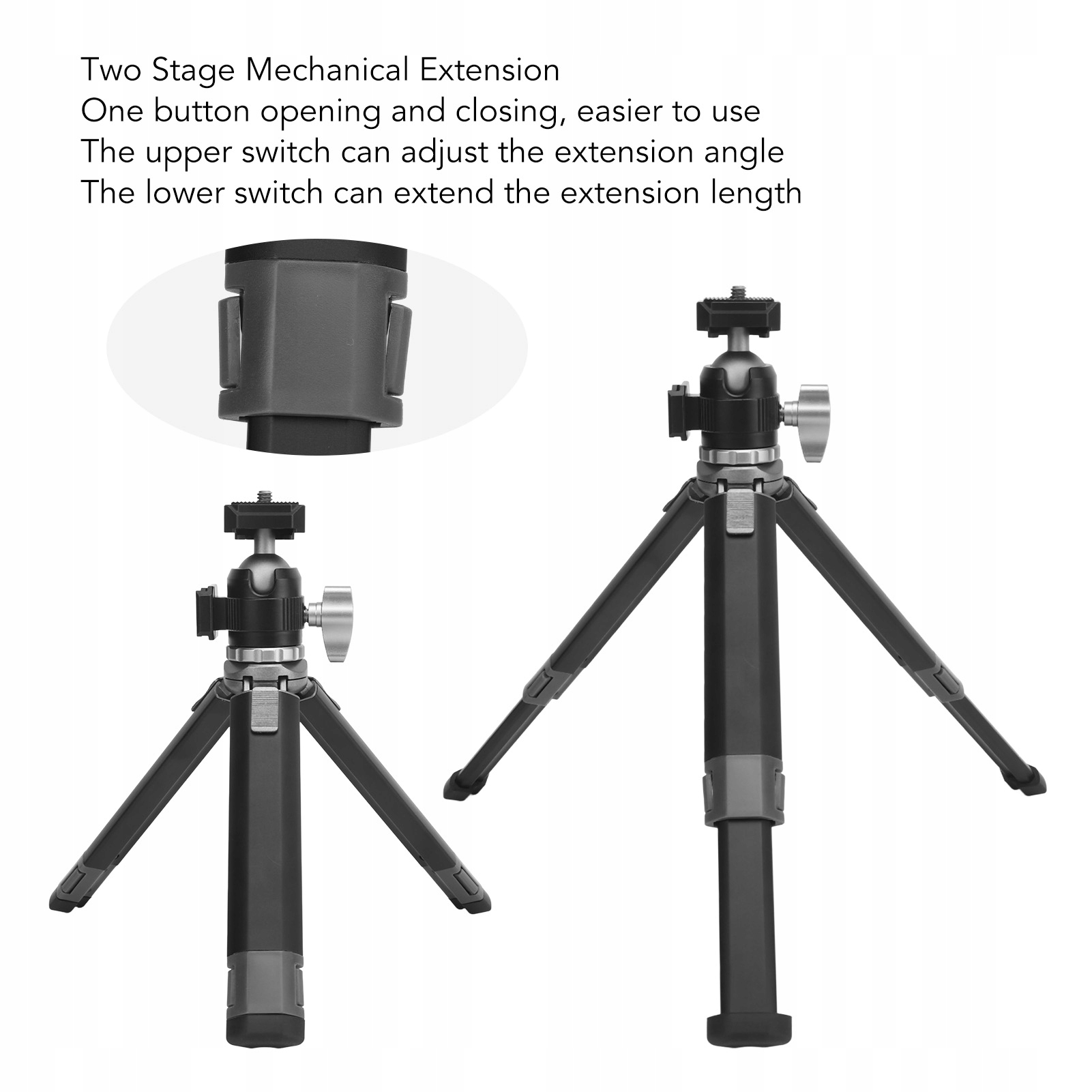 2. 2-СТУПЕНЧАТЫЙ МЕХАНИЧЕСКИЙ ТЕЛЕСКОП: Мини-штатив поддерживает двухступенчатый телескоп, верхний переключатель может регулировать угол выдвижения, а нижний переключатель может увеличивать длину, одна кнопка открывается и закрывается, его легче использовать.