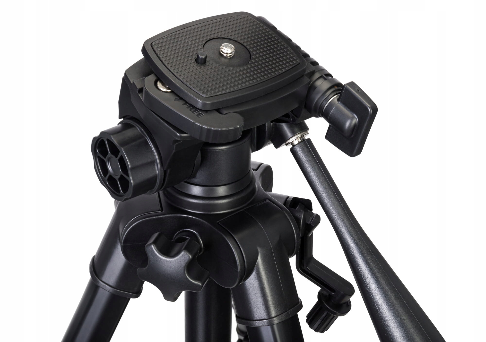 Эта трехсекционная напольная подставка изготовлена из алюминия. Каждая ножка имеет замки-защелки, позволяющие отдельно регулировать высоту. Центральную стойку можно поднять или опустить с помощью специальной фиксирующей ручки. Высота штатива 700 мм. Центральная колонна оснащена крючком. Он используется для увеличения веса штатива для обеспечения максимальной устойчивости. Пузырьковый уровень используется для расположения камеры параллельно земле.