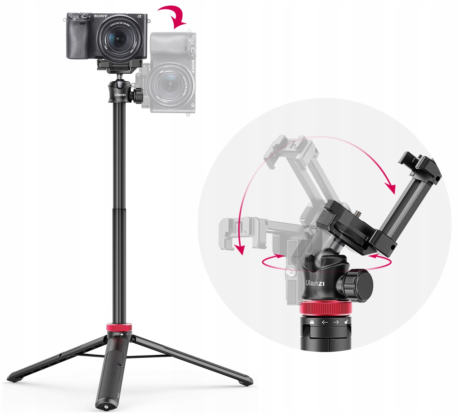 Освободите руки. Раздвиньте ножки, чтобы использоватьUlanzi M-44 в качестве штатива. Хотите ли вы делать вертикальные или горизонтальные снимки? Без проблем. Вращающаяся на 360 градусов головка позволяет легко расположить камеру, видеокамеру или телефон по мере необходимости. Используйте удобную ручку, чтобы зафиксировать его в выбранном положении.