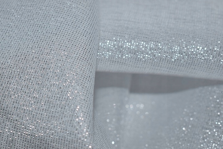 Помимо белой нити, в нити попеременно вплетена серебряная мерцающая нить, которая придает ткани волшебный блеск, повышая ее эстетическую ценность.