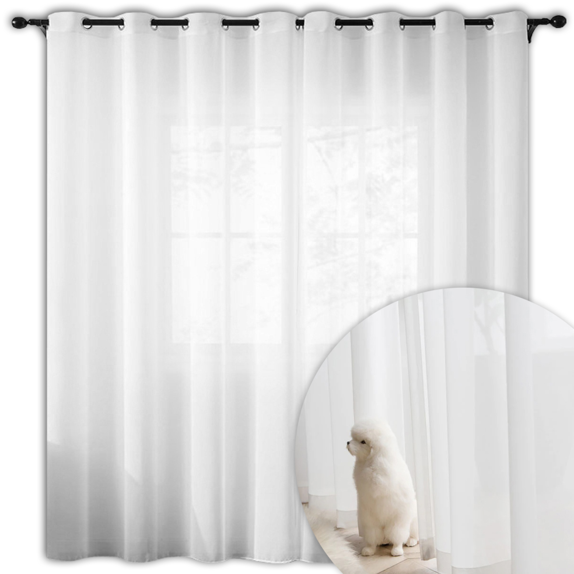 Штора готова для гостиной размером 200 см в ширину и 250 см. длиной до пола, аккуратно сшита из белоснежной вуали.