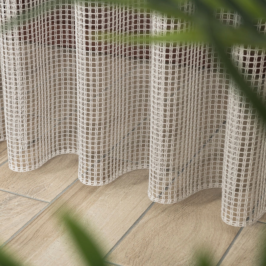 Мягкая и нежная. легкий, прекрасно драпируется, пропускает много света и благодаря сетчатой структуре -> хорошо пропускает воздух.