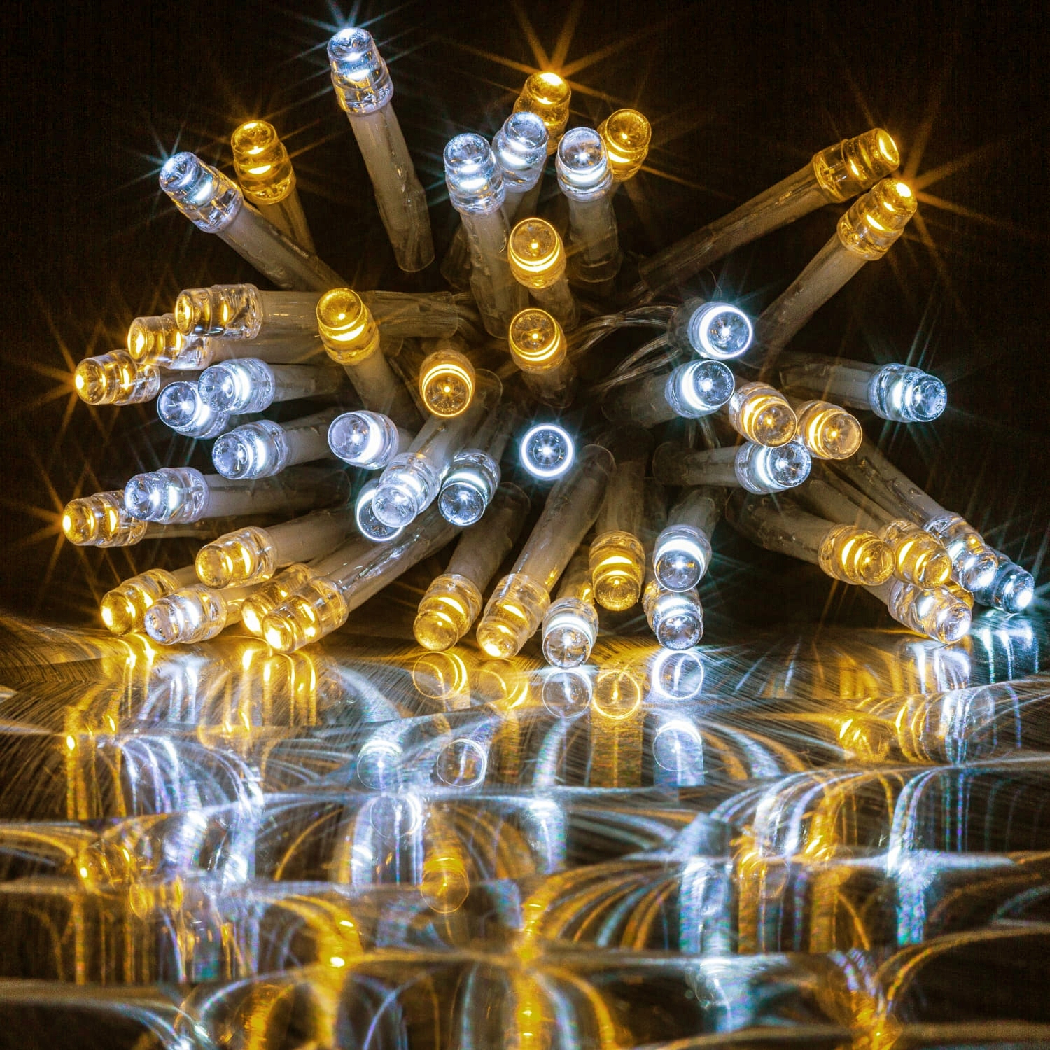 100 светодиодных декоративных светильников для использования на открытом воздухе и дома. Кабель усилен и водонепроницаем, поэтому погодные условия не влияют на его работу, а большой диаметр каркаса обеспечивает интенсивный световой эффект
