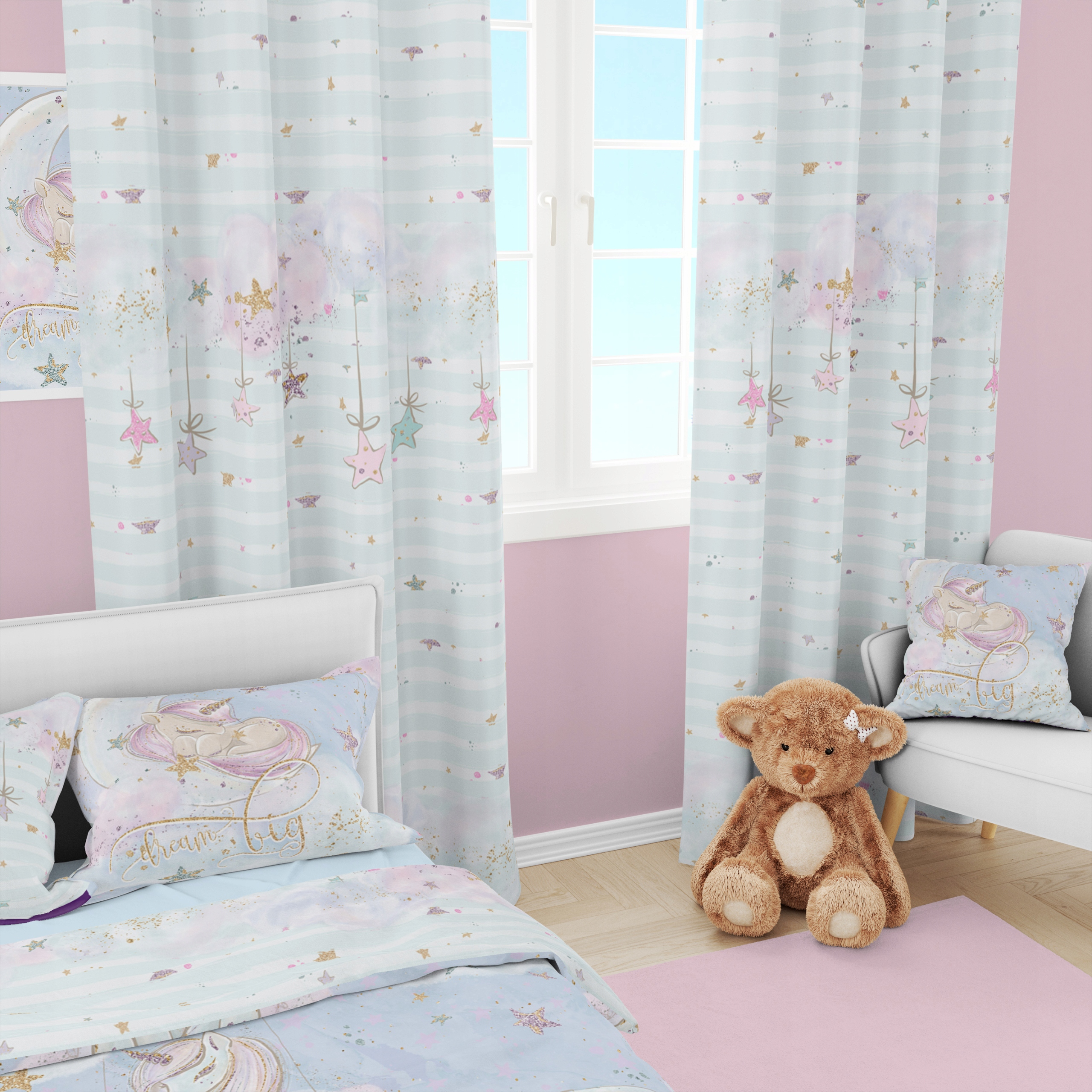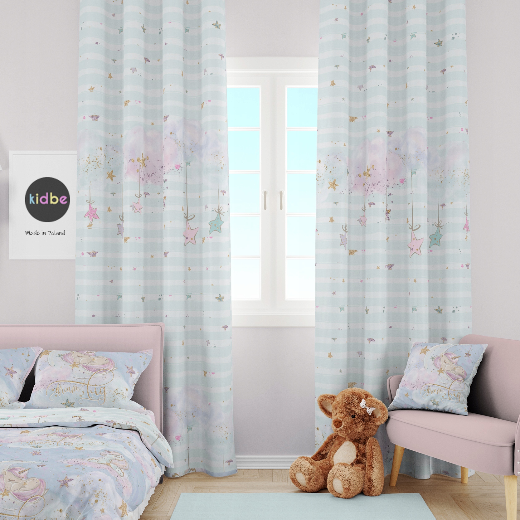 Шторы для детской комнаты KIDBE. Уникальная, неповторимая графика и высокое качество изделия – отличная идея для оригинального подарка.Вместе с дополнительными элементами коллекции KIDBE, такими как подушки, одеяла и постельное белье – мы сможем устроить неповторимый, уютный интерьер для самых маленьких.