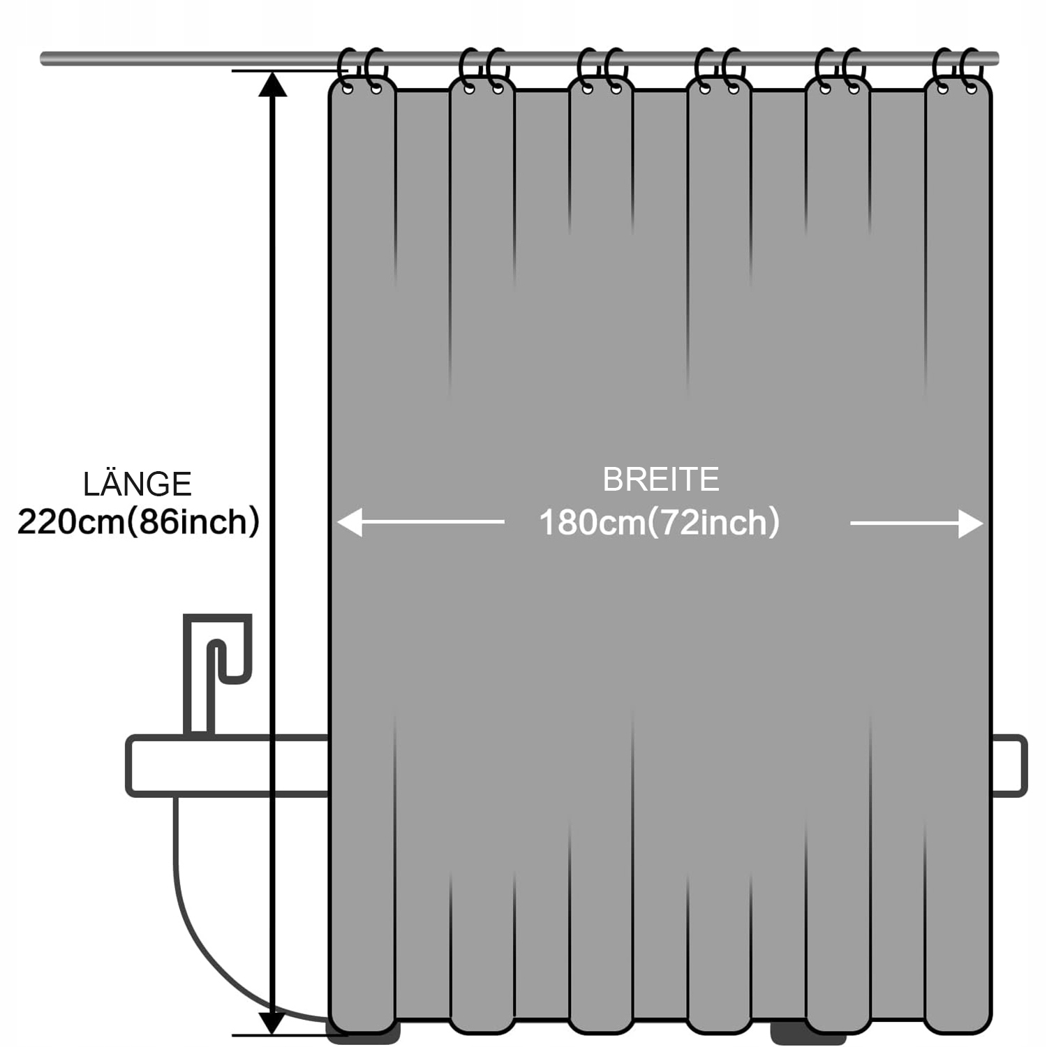 - 🛁【Размер】: 180 см x 220 см (Ш x В). В комплекте: 1 занавеска для душа и 12 белых крючков для занавесок. Простая установка.