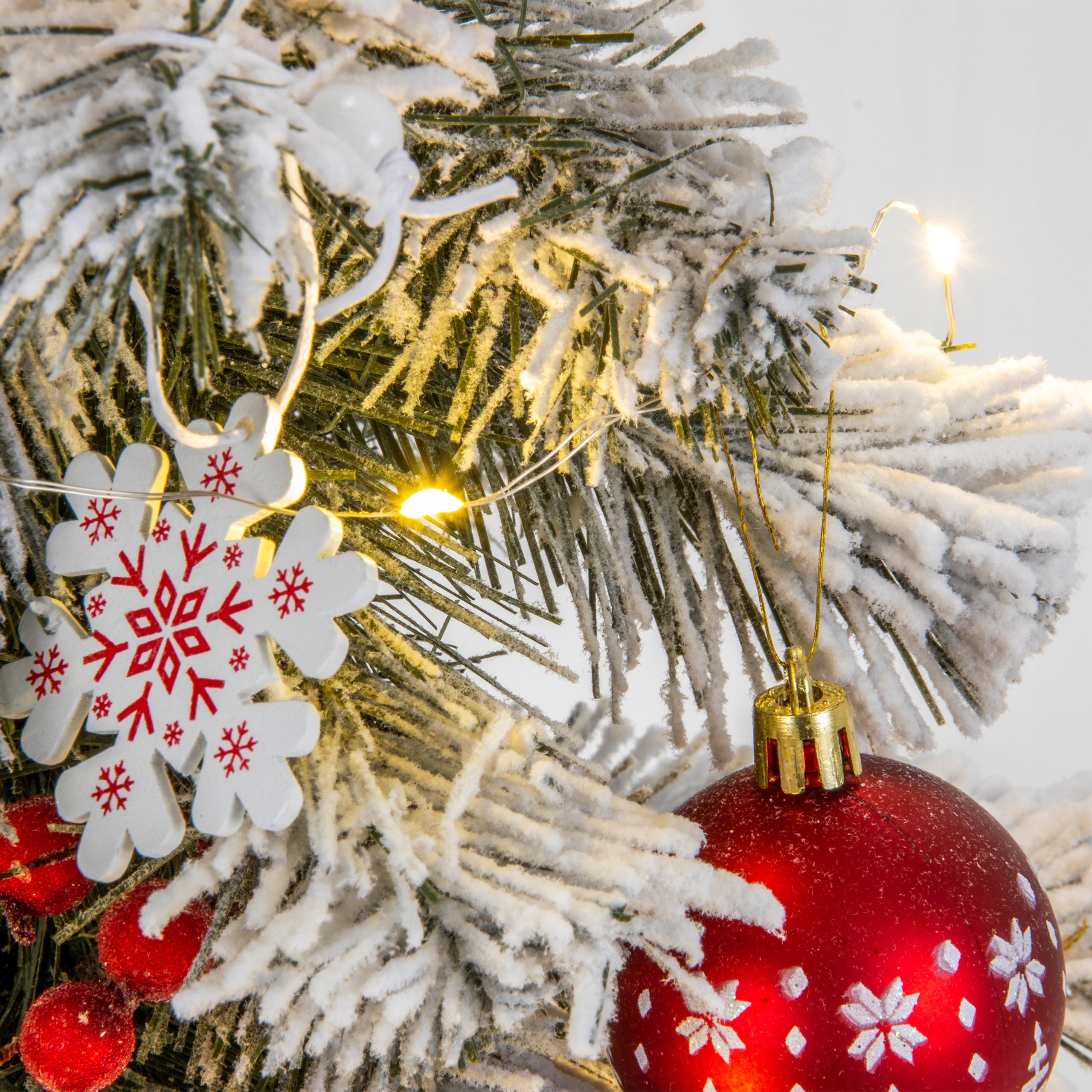 Красивая заснеженная елка высотой 60 см с аксессуарами для украшения в красно-белых тонах