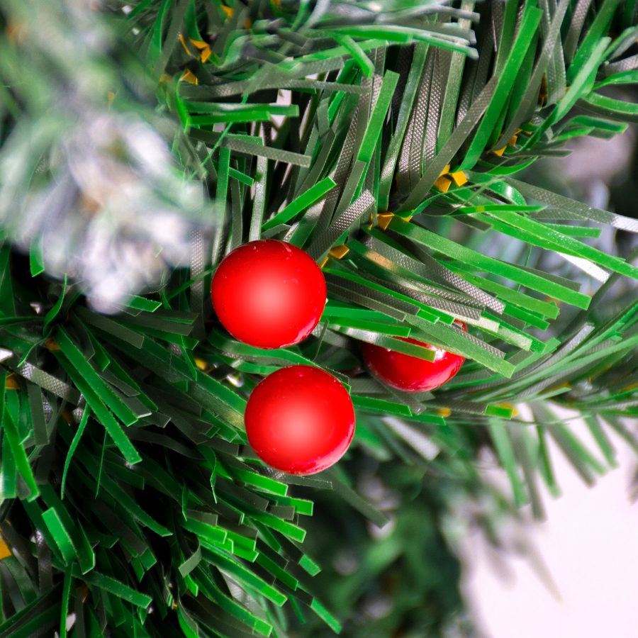 Тщательно продуманные и в то же время прочные ветки, усыпанные заснеженной хвоей, прекрасно удерживают безделушки, фонарики и другие украшения. Вместе с елкой вы получаете набор сосновых шишек и красной рябины, благодаря чему елка в разложенном виде выглядит эффектно.