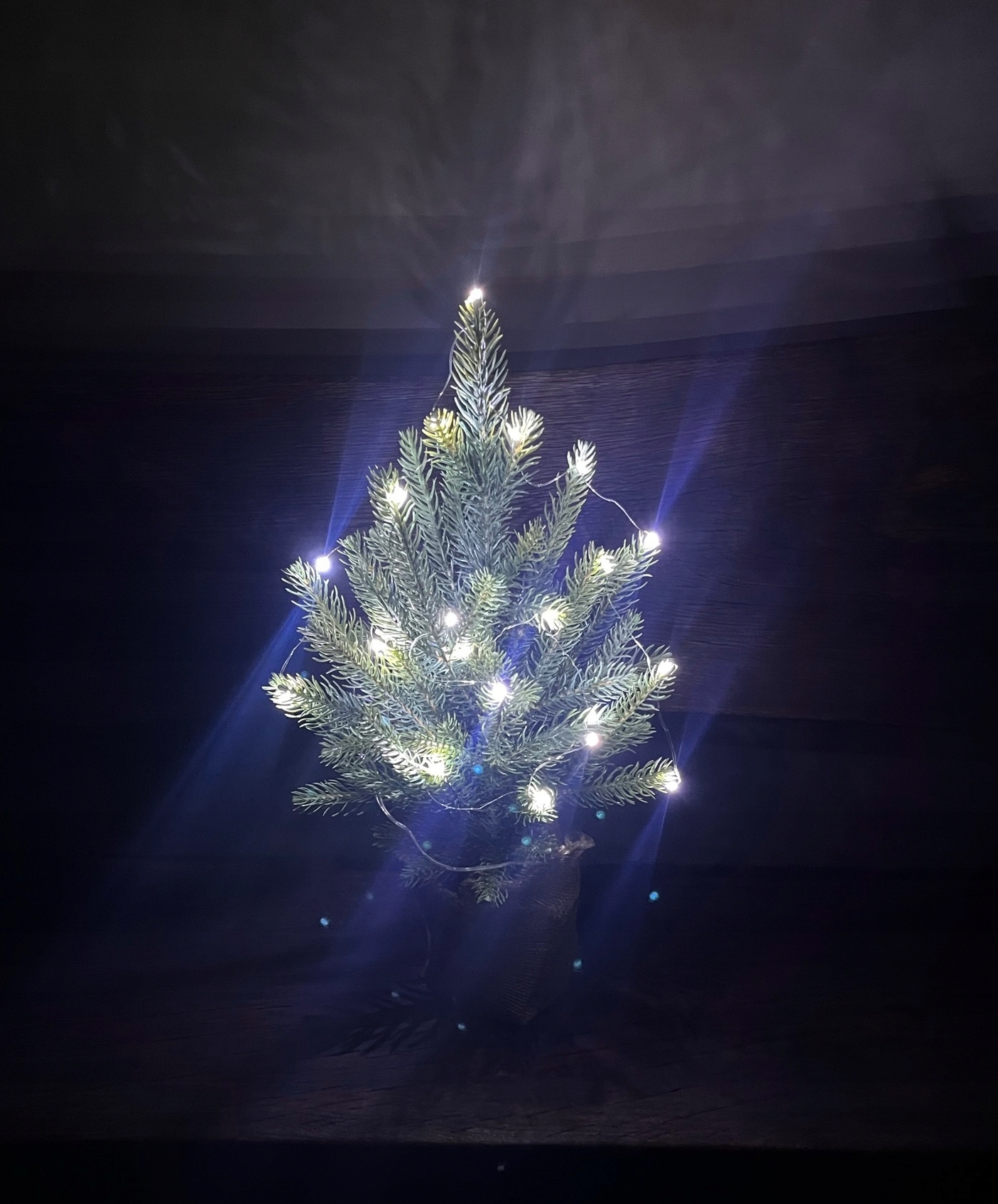 Елка устанавливается в утяжеленный горшок. .бетон и обернут натуральным джутом.