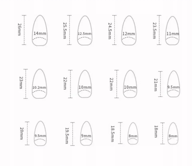 В наборе разные размеры, поэтому вы сможете идеально подобрать искусственный ноготь к своей натуральной ногтевой пластине.